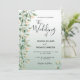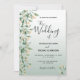 À frente: Tema botânico. Gradiente verde sábio, fundo ombre. Decorados com verde, prigos e folhagem com flores de ouro pequeno. Escrita escrita em letras grandes modernas, tipografia com o texto: O casamento de. Modelos para seus nomes e detalhes do casamento. Texto preto. Voltar: plano de fundo verde sage.
