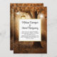 Um convite para o casamento com uma ilustração encantadora e caprichosa em cores ricas castanho e amarelas. Uma floresta mística mágica com uma grande árvore segurando uma lanterna antiquada. Luzes de fada dançando ao redor. Design místico mágico.