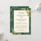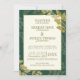 Belo design de folha de ouro e convite para casamento verde esmeralda com cores de fundo e texto elegante de ouro.