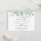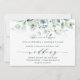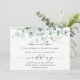 Este convite para o casamento apresenta cor d'água eucalipto, verde botânico e folhas azuis-claras com caligrafia moderna.