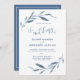 Este Cartão de Convite para Casamento de Azul e Branco Deixa o Casamento e é projetado com folhas azuis de cor aquosa que fluem suavemente. O texto inclui: Nomes de Cheio, data de casamento, hora, local e endereço da noiva e do noivo em fundo branco com sotaques azuis. O texto inverso inclui: Local de Recepção e Horas em um plano de fundo azul correspondente. Para personalizar, basta inserir seus detalhes em nosso modelo fácil, substituindo o texto de exemplo. Certifique-se de ver a Coleção de Casamentos de Folhas Azul e Branco completa para cartas e acessórios correspondentes.