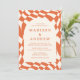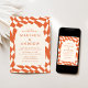 Convide convidados para comemorar seu dia especial com convites de casamento para fotos do Quadro de Retro Laranja! O convite mostra seus nomes e detalhes de casamento em letras laranja cercadas por um quadro de arco colorido. O plano de fundo apresenta um padrão de tabuleiro abstrato com um esquema de cor laranja e creme. O convite reverte para exibir sua foto de noivado vertical com sangramento de cheio.