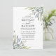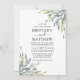 O Cartão de Convite para Casamento de Molerna Botânica de Cor Biológica Delicada Moderna inclui folhagem verde, folhas azuis empoeiradas, folhas verdes de sábio e outras lindas culturas botânicas. Foto de volta.