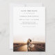 Anuncie seu dia especial com nosso casamento de fotos modernas, Rustic, salve a data. Esta carta elegante apresenta uma foto cativante do casal contra um cenário romântico do pôr do sol, perfeito para aqueles que buscam uma mistura de encanto rústico e chic moderno. Ideal para casamentos de destino românticos casuais, isso salva o cartão de data oferece uma sensação luxuosa de "boho" com uma design minimalista. O formato duplo e o estilo contemporâneo garantem que ele se destaque, fazer-o uma escolha perfeita para casais na moda. Destaque sua história de amor com este anúncio de data exclusivo e memorável.