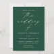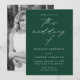 Convite de casamento minimalista e moderno, com detalhes de seu casamento em letras brancas simples com "o casamento de" em um roteiro elegante de caligrafia com fundo verde. O convite reverte para exibir sua foto de noivado vertical. Projetado para coordenar com a nossa coleção de casamento do Modern Elegance.