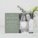 Convite moderno para casamento de fotos com detalhes do seu casamento à esquerda da design em letras brancas com ênfase em script de caligrafia em um fundo verde sábio. Personalize a frente do convite adicionando seus nomes, detalhes do casamento e fotos verticais do noivado. A parte traseira do convite fornece espaço para texto e fotos adicionais. Projetado para coordenar com a nossa coleção de casamento do Modern Elegance.