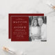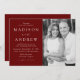 Convite para casamento de fotos moderno com detalhes do seu casamento à esquerda da design em letras brancas com acentos de script de caligrafia em fundo de burgundy. Personalize a frente do convite adicionando seus nomes, detalhes do casamento e fotos verticais do noivado. A parte traseira do convite fornece espaço para texto e fotos adicionais. Projetado para coordenar com a nossa coleção de casamento do Modern Elegance.