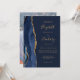 A borda esquerda deste elegante convite de casamento moderno apresenta um marinho azul de aquarela agata borda aparada com falso brilho dourado. O texto personalizável combina manuscrito dourado, fontes em copperplate e itálico em um fundo azul marinho. Substitua facilmente a imagem de exemplo no verso por sua própria foto vertical.