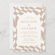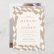 Convide convidados para comemorar seu dia especial com convites para casamento de fotos do Quadro de Retro Beige Checkerboard para na moda! O convite mostra seus nomes e detalhes de casamento em cartazes coloridos de areia no deserto cercados por um quadro de crosta de creme leve. O plano de fundo apresenta um padrão de tabuleiro abstrato com um esquema de areia e cor de creme no deserto. O convite reverte para exibir sua foto de noivado vertical com sangramento de cheio.