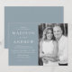 Convite para casamento de fotos moderno com detalhes do seu casamento à esquerda da design em letras brancas com ênfase em script de caligrafia em um fundo azul empoeirado. Personalize a frente do convite adicionando seus nomes, detalhes do casamento e fotos verticais do noivado. A parte traseira do convite fornece espaço para texto e fotos adicionais. Projetado para coordenar com a nossa coleção de casamento do Modern Elegance.
