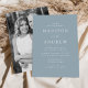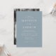 Convite de casamento minimalista e moderno, com detalhes de seu casamento em letras brancas com acentos de roteiro de caligrafia com fundo azul empoeirado ou cor de sua escolha. A parte de trás do convite de casamento da moda mostra sua foto de noivado vertical. Projetado para coordenar com a nossa coleção de casamento do Modern Elegance.