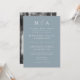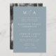 Convite de casamento minimalista e moderno com as iniciais do monograma e detalhes de casamento mostrados em letras brancas com acentos de escrita de caligrafia. O fundo azul empoeirado pode ser alterado para uma cor de sua escolha. A parte de trás do convite de casamento do monograma mostra sua foto de noivado vertical. Projetado para coordenar com a nossa coleção de casamento do Modern Elegance.