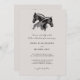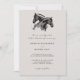 Uma tinta encantadora e um esboço de lavagem de dois cavalos em uma pose amorosa decoram lindamente este convite com sotaques caligraficos modernos. Perfeito para um país, celeiro ou tema de casamento rústico, esta design captura o calor e a simplicidade de uma celebração ocidental, estabelecendo o tom para um dia inesquecível no campo. Design preto e branco sobre um fundo quente.