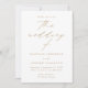 Convite de casamento minimalista e moderno, com detalhes de seu casamento em simples carta dourada com "o casamento de" em um roteiro elegante de caligrafia com fundo branco. O convite reverte para exibir sua foto de noivado vertical. Projetado para coordenar com a nossa coleção de casamento do Modern Elegance.