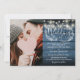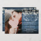Um convite de casamento rústico com luzes bonito de cordas e uma delicada garland floral rústica desenhada à mão de folhagem botânica com tipografia de na moda, sobre um fundo de madeira rústica azul. Personalize com sua foto especial e informações do dia do casamento. Projetado por Thisnotme©