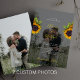O convite de casamento de fotos de Trendy sobrepõe-se a buquês de girassol bonitos em um fundo escuro e transparente. ++++++ Ideal para o seu verão ou outono caia no elegante jardim ao ar livre, celeiro de fazenda ou casamento no quintal. +++++++++++++++ Personalize-o com as 2 fotos de noivado da noiva e do noivo, nomes em faux gold script e detalhes de casamento!