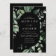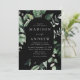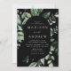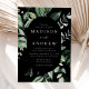 Convites elegantes de casamento com seus detalhes de casamento aninhados em um quadro oval cercado por eucalipto, samambaias e outros ricos verdes com fundo preto. Os convites de casamento botânico modernos revertem para um fundo negro sólido. Projetado para coordenar com nossa coleção de casamento Abundant Greenery.