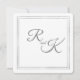 Delicar rosas brancas nos cantos superior esquerdo e inferior direito de um fundo branco elegante. Dupla moldura prateada aninhando os detalhes do convite de casamento na tipografia da cinza.