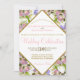 Este elegante convite para o casamento floral apresenta um quadro em forma de diamante de ouro rodeado por um monte de flores da primavera, incluindo rosas cor-de-rosa, hipnésia roxa ou lavanda, e orquídeas brancas e lírios calla. Um convite para um casamento de primavera ou verão.