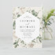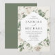 O elegante convite de casamento floral branco apresenta seus nomes e detalhes de casamento moldados por folhas pintadas de cor d'água eucalipto, folhagem verde-luxuosa, rosas de branco e creme e flores de lisianthus.