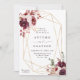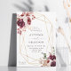 Este convite para o casamento inclui buquês de flores de aquarela de dália, rosa de jardim, peônia, capim de pampas, e hydrangea em vermelho-burgundy, terracotta, cor-de-rosa-pincelada sobre folhas de outono com uma falso estrutura geométrica de ouro. Para uma personalização mais avançada deste design, clique no BOTÃO FERRAMENTA DESIGN AZUL. Itens correspondentes também estão disponíveis.