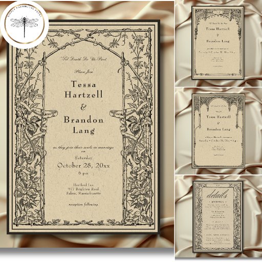 Elevem seu casamento gótico com um convite de casamento inspirado na medieval que exude elegância e mistério do eterno. Projetado para replicar um sentimento antigo de colheita, este design espetacular apresenta uma delicada borda gótica de linhagem negra numa vintage, um fundo colorido de marfim pergaminho envelhecido, evocando o charme de uma era passada. O texto, "Até a morte do nosso lado", pode ser editado e alterado, ou completamente suprimido, se preferir. Deixe sua história de amor se desenrolar com um convite tão inesquecível quanto seu dia. Criado pela imprensa simplesmente de farmácia.