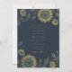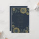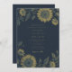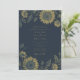 Este convite de casamento azul marinho apresenta uma fronteira rica e detalhada de girassóis gravados, enquadrando seus detalhes de casamento em texto elegante e dourado. O layout botânico simétrico combina o calor rústico com elegância formal — ideal para casamentos de jardim ou finais de primavera. O verso inclui um monograma personalizado de girassol com as iniciais do casal para um toque de acabamento refinado. Note-se que o ouro é uma cor impressa, não é metálico ou folha.
