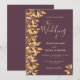 Um convite de casamento botânico no cassis, roxo profundo e ouro falso. Decorado com folhagem de ouro falso e grampos. Escrita escrita em letras grandes modernas, tipografia com o texto: O casamento de. Modelos para seus nomes e detalhes do casamento. Texto do ouro. Traseira: fundo colorido do gabinete.