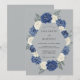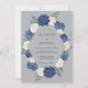 Rosas elegantes em aquarela em azul-marinho profundo e creme suave criam uma grinalda floral formal. Folhagens exuberantes e folhas delicadas fornecem um contraste sofisticado contra o fundo cinza ardósia frio. Este design sombrio e refinado é ideal para uma cerimônia clássica de clima frio, oferecendo uma estética polida para um evento sazonal.