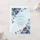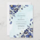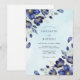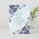 Este design apresenta anêmonas índigo profundas com contornos metálicos dourados brilhantes. Contra um suave fundo de aquarela azul claro, os elementos botânicos incluem folhas prateadas delicadas e pétalas flutuantes. Isso evoca um clima invernal sereno e majestoso, perfeito para um evento sazonal elegante.