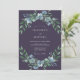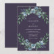 Este design apresenta um rico fundo de ameixa que cria uma atmosfera sombria e sofisticada. Flores delicadas em aquarela em tons de azul poeirento e verde salvia formam um arranjo botânico exuberante. Pequenas flores elegantes que lembram amores-perfeitos e rosas estão aninhadas entre folhas macias e afiladas. Esta paleta de tons frios é ideal para um evento noturno sazonal.
