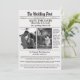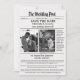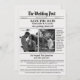 Casamento de jornal com script moderno salve a data com três fotos, foto do noivo e da noiva quando eram crianças e quando eram adultos.