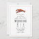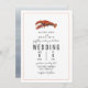 Um convite de casamento com uma design de cor de água inspirada em chambray. A frente apresenta a ilustração de uma lagosta e de uma borda vermelha esmaecida. Personalize o texto da cinza.