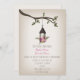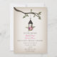 Um convite de casamento com ilustração de uma lanterna cheia de um arranjo de flor rosa pendurado num ramo de árvore com folhas verdes. Personalize o texto com detalhes da sua ocasião.