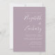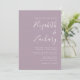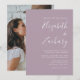 Este simples convite de casamento moderno apresenta um texto branco sobre um fundo poeirento de lavanda. Adicione os nomes da noiva e do noivo na caligrafia de escrita manual do na moda e os detalhes na fonte sans serif. Substitua facilmente a imagem de exemplo no verso por sua própria foto.
