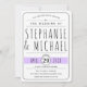 Este maravilhoso convite de casamento apresenta uma design de tipografia branca e negra, elegante e contemporânea, complementada por um toque de lavanda roxo. A estética geral exude elegância e sofisticação, com uma reviravolta vintage. O texto principal é exibido lindamente a preto em um fundo branco nítido, enquanto a data do casamento é destacada em uma charmosa faixa de lavanda. Para adicionar um toque de refinamento, uma borda negra enquadra o convite inteiro. No verso, um encantador padrão de cruzes brancas enfeita um fundo lavanda calmo. A melhor parte é que você tem a liberdade de personalizar vários aspectos do convite, incluindo texto, cor e tamanho do texto, fonte, cor do plano de fundo, assim como a cor da faixa de lavanda e o padrão no verso.