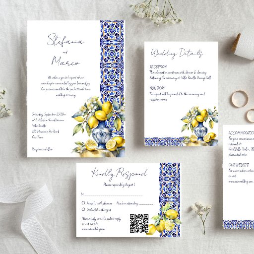 Amalfi Positano Vietri azul Majolica azulejos limões casamento modelo convite instantâneo de descarregamento digital instantâneo, azulejos mediterrâneos de cor azul e amarela com um monte de citrinos com limões e flores em cerâmicas azuis cartões de convite de casamento vaso
