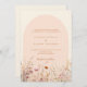 Um convite de casamento elegante. Um fundo creme, cor bege e um arco colorido de pêssego. Decorado com flores silvestres de cor d'água em bege, rosa.