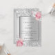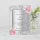 Fundo de aspecto fino prateado decorado com flores brancas e cor-de-rosa, flores e brilho fino prateado, brilhos. Personalize e adicione seus nomes e detalhes do casamento. Letras negras.