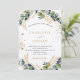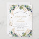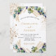 Um fundo branco decorado com verde de eucalipto e folhas de ouro e gotas falsas de ouro. Personalize e adicione seus nomes e detalhes do casamento. Letras pretas e ouros coloridas. Traseira: fundo branco com quedas de brilho de falso ouro