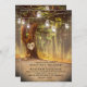 Elegantes convites para casamentos vintage com um lago romântico num cenário de floresta, uma velha árvore rústica com um coração esculpido e suas iniciais dentro, frascos de mason com luzes cintilantes e um modelo de casamento personalizável.