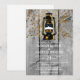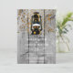 Casamento de madeira de celeiro cinza rústico com uma parede de madeira de celeiro desgastada com uma linda lanterna com uma paisagem pintada e uma chuva de confetes. A parte traseira do convite é uma tonalidade verde musgo terrosa e um belo contraste.
