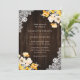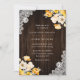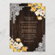 Convite para casamento floral de cor amarela e pêssego, apresentando um buquê de flores amarelas e de pêssego contra um fundo de madeira de celeiro adornado com rendas florais brancas. Design de cartão perfeito para convidar seus hóspedes para sua festa de casamento rústica amarela e pêssego.