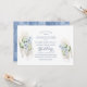 Linda mão pintou galhos e folhas de aquarelas, de eucalipto, criadas em uma variedade de verduras naturais e azuis poeirentos. Os detalhes do seu casamento foram criados com fontes decorativas, digitação em um tom elogioso de azul. O fundo tem um fundo azul de madeira abarrotada. O resultado final é um convite de casamento delicado, mas vibrante, que seus convidados terão todo o prazer em receber e responder.