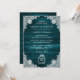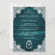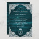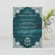 Convite de casamento teal russo com um jarro de mason em um fundo de madeira rústica adorado com um rendas floral branco. Personalize facilmente este convite de casamento rústico para complementar seu país rústico, ou festa de casamento de celeiro.