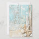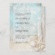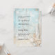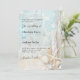 Um convite de casamento para a praia com madeira derivada, concha e areia. Cores azuis e beges. Personalize e adicione seus nomes e detalhes.