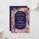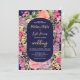 O convite de casamento chic com guião floral brilhante boêmio, com bonito mão pintada com flores brilhantes e ousadas modernas, mistura uma sensação vintage, com corais, flores roxas, rosas rosa e verde com uma celebração de festa de casamento botânica. Com uma tipografia moderna e ouro e marinho azul.