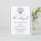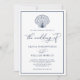Este simples design de convite para casamento na praia tem uma casca de couro cabeludo no topo, uma elegante caligrafia, e um quadro à volta da borda, com fundo branco e texto azul marinho.