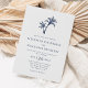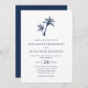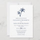 Este simples convite para o casamento de praia tropical apresenta duas palmeiras no topo, com texto elegante clássico, num esquema de cores branco e azul marinho, com a coordenação do azul marinho no verso.