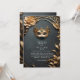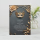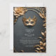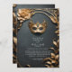 Evoque a magia de uma bola de mascarada com este belo convite de casamento. Um fundo negro de carvão enfeitado com ouro intrincado simulado decoração e folhagem 3D e flores cria uma atmosfera luxuosa e encantadora. A máscara do mascarada ouro toma o palco central, adicionando um elemento de mistério e glamour ao seu dia especial.